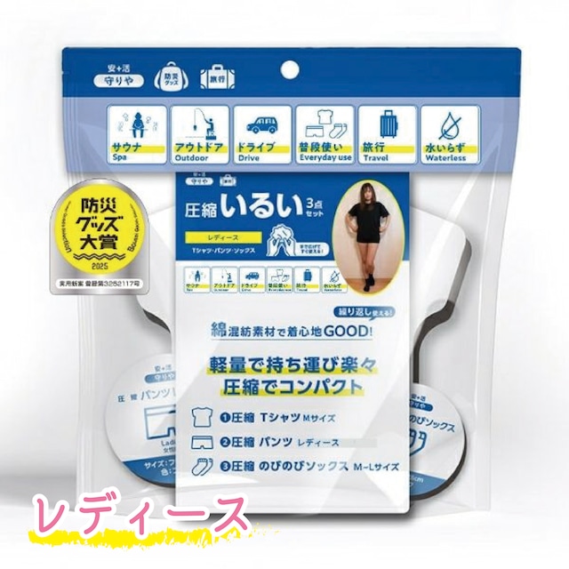 ★圧縮いるい3点セット!!★ 災害時の着替え問題に「備えあれば憂いなし」 Tシャツ、パンツ、ソックスが手のひらサイズに。 防災バッグにも余裕で入る3点セット。 1.圧縮Tシャツ(M サイズ) 2.レディース用フリーサイズ「ボクサー型」の下着 3.のびのびソックス1個(M-L•20cm~28cm) 【セット内容】 1.圧縮Tシャツ(Mサイズ) 本製品は、M サイズ(胸囲約80㎝~90㎝)のTシャツを、直径約90mmというコンパクトサイズに圧縮した便利な携帯用ウェアです。手のひらに収まるサイズ感で、持ち運びや備蓄にも最適です。 生地には、透け感のない黒色の綿素材を使用。見た目にも安心感があり、着用シーンを選びません。 普段使いはもちろん、防災用の備蓄、出張時の予備着替え、旅行、キャンプなどアウトドアシーンでも活躍します。かさばらず軽量なので、バッグやスーツケースにもすっきり収まります。 使い捨てではなく、洗濯して何度でも繰り返し使用可能です。経済的でエコな選択肢として、多くのお客様にご好評いただいています。 2.レディースパンツ1個(フリーサイズ「ボクサー型」) 「直径約60mm」とコンパクトに圧縮されているので、持ち運びにも備蓄にも便利です。 普段使いはもちろん、防災用、出張、旅行、キャンプなどのアウトドアレジャーにもお使い頂けます。使い捨てではないので、洗濯して何度でもご使用頂けます。 3.のびのびソックス1個(M-L•20cm~28cm) 「直径約45mm」とコンパクトに圧縮されているので、持ち運びにも備蓄にも便利です。 普段使いはもちろん、防災用、出張、旅行、キャンプなどのアウトドアレジャーにもお使い頂けます。厚みのあるしっかりとした生地で内側はパイル地に。使い捨てではないので、洗濯して何度でもご使用頂けます。
