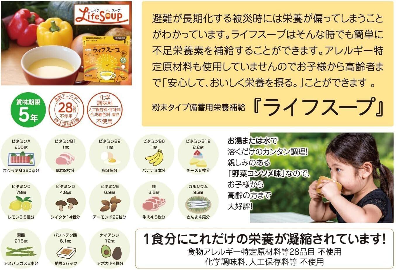 ライフスープ:デキストリン(国内製造)、野菜エキスパウダー(馬鈴薯、玉葱、人参)、食塩、砂糖、酵母エキス、食物繊維、セロリパウダー/炭酸Ca、ピロリン酸第二鉄、V.C、V.E、ナイアシン、パントテン酸Ca、V.B1、V.B6、V.B2、V.A、葉酸、V.D、V.B12