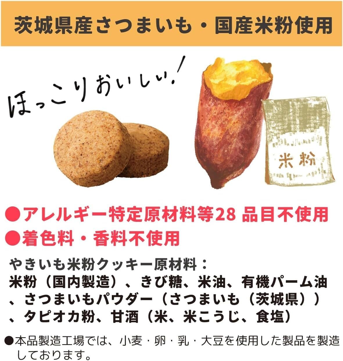 FREEats 米粉クッキー やきいも味:米粉(国内製造)、きび糖、米油、有機パーム油、さつまいもパウダー(さつまいも(茨城県))、タピオカ粉、甘酒(米、米こうじ、食塩)