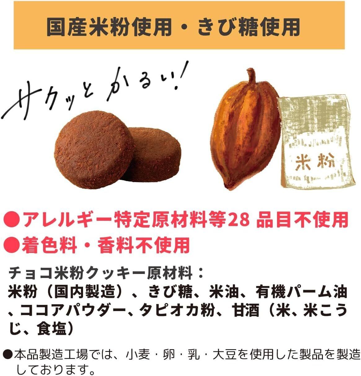 FREEats 米粉クッキー チョコ味:米粉(国内製造)、きび糖、米油、有機パーム油、ココアパウダー、タピオカ粉、甘酒(米、米こうじ、食塩)