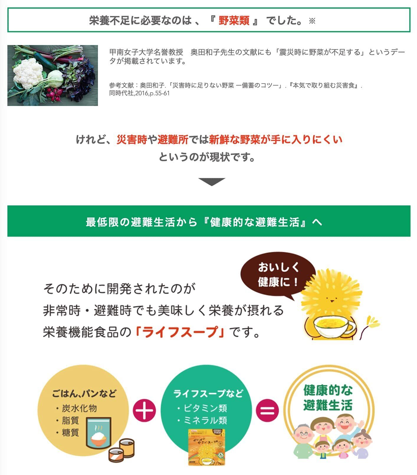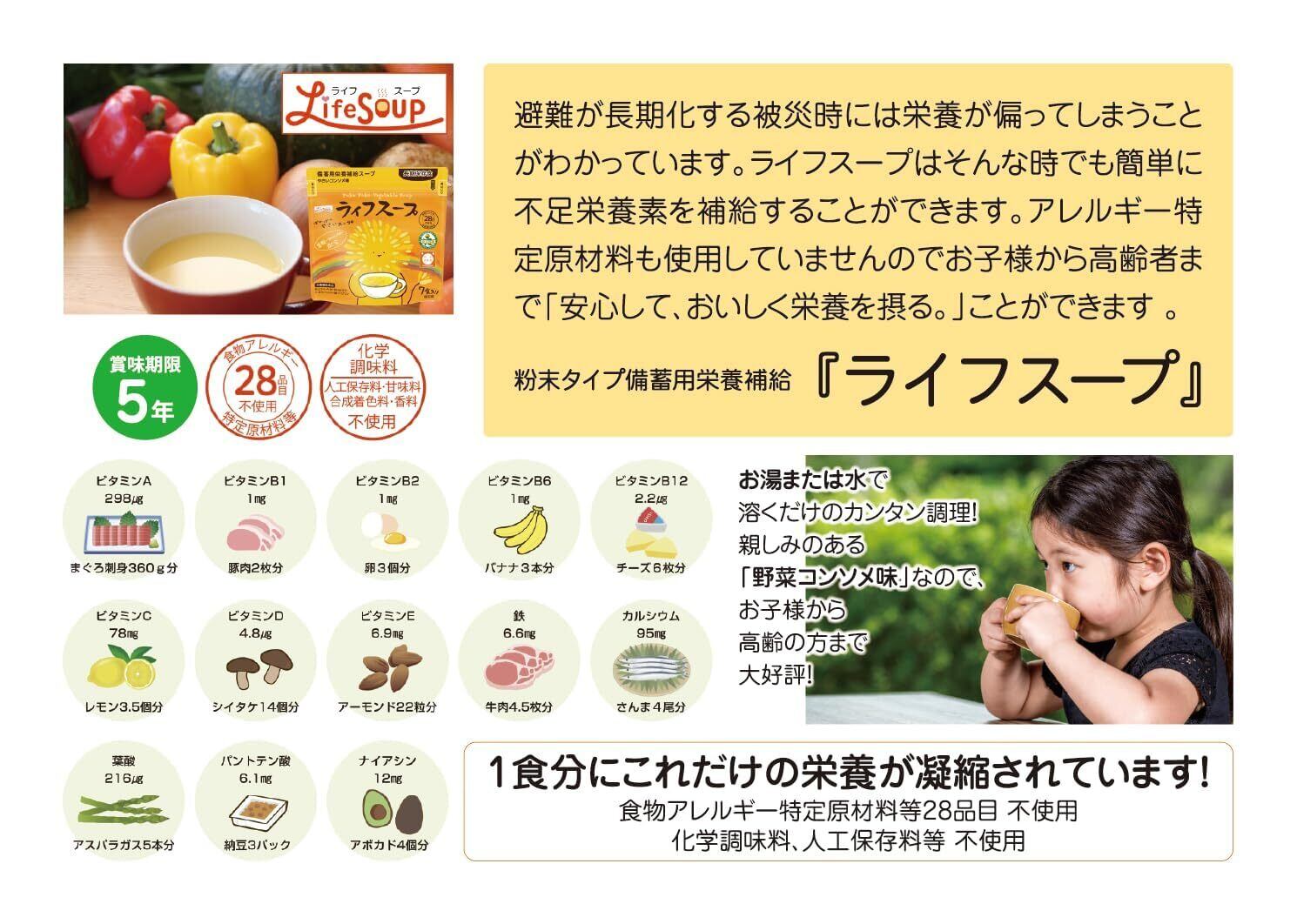 【ライフスープ】デキストリン(国内製造)、野菜エキスパウダー、食塩、砂糖、酵母エキス、食物繊維、セロリパウダー/炭酸カルシウム、ピロリン酸第二鉄、V.C、V.E、ナイアシン、パントテン酸カルシウム、V.B1、V.B6、V.B2、V.A、葉酸、V.D、V.B12