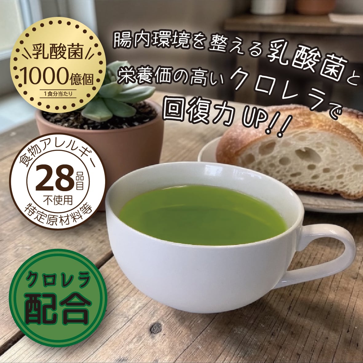 本製品には、1食分あたり1,000億個の乳酸菌と豊富なクロレラを含み、身体全体のコンディションをサポート。腸内環境を整え、免疫力を高める効果が期待できます。